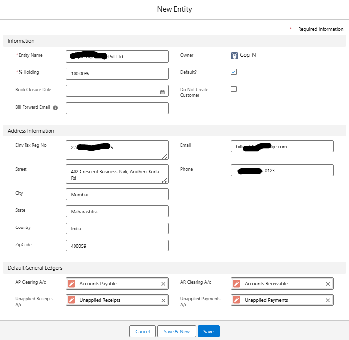 When creating any transaction or master data record, you’ll be prompted to select the Entity it belongs to.
