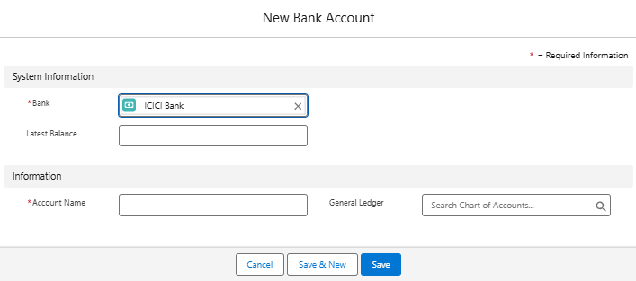 | General Ledger | Select the GL account this bank account maps to |