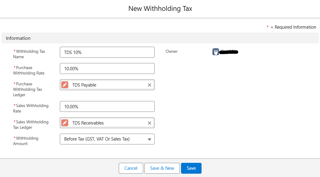 | Withholding Tax Name | Name of the component (e.g., TDS 10%) |