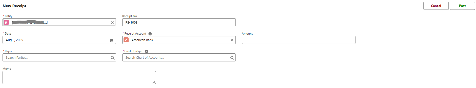 | Receipt No | The default transaction series will be used. Choose a different one, if needed. |