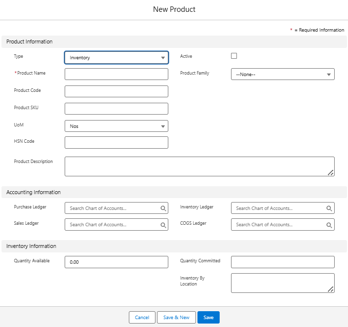 - Product Info such as Type (Inventory / Non-inventory / Service), Name, Code, SKU, UoM, HSN, Description