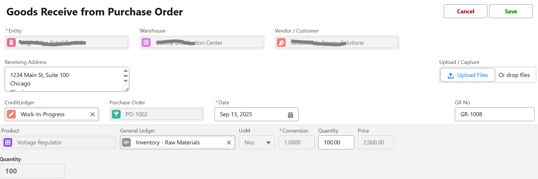 The system will automatically pull in the PO details (entity, warehouse, vendor, and receiving address).